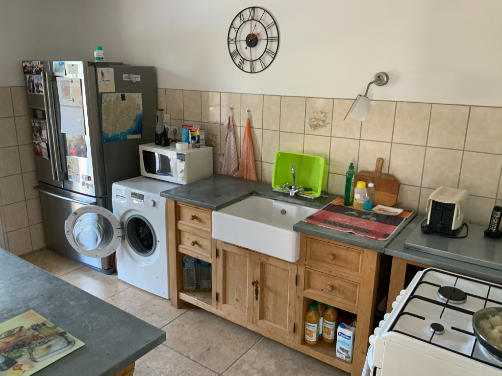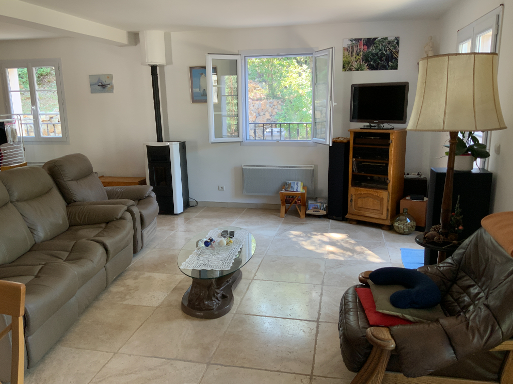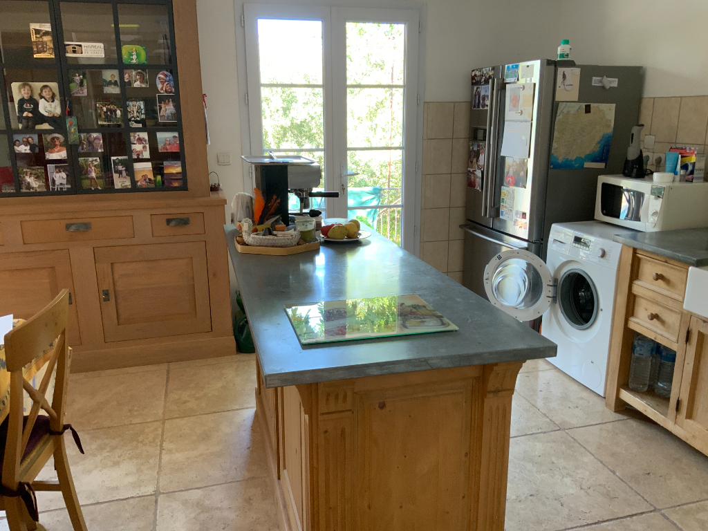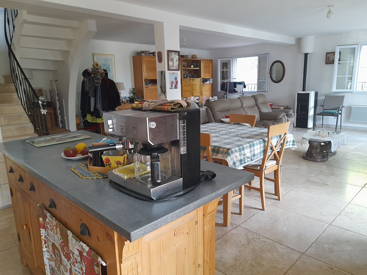 – au rez de chaussée d’une jolie pièce de vie de 72 m² en pierre de travertin avec poêle à granulés, une cuisine aménagée, l’ensemble donnant sur une terrasse de 35 m2 avec une pergola en fer forgé.