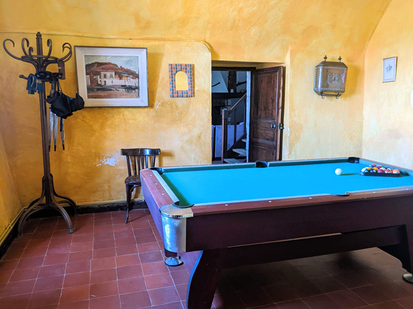 Au rez de chaussée : un hall d’entrée donnant sur une salle à manger, une cuisine (avec cellier) 2 salons, une salle de billard, une grande pièce, deux chambres, une salle d’eau/wc, un débarras.