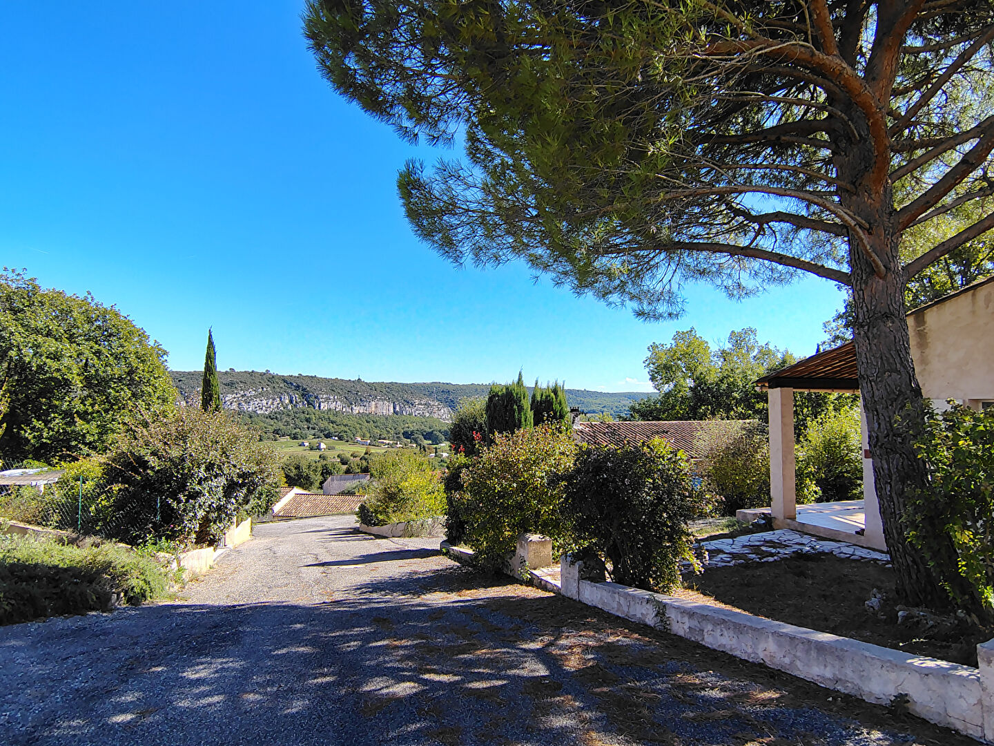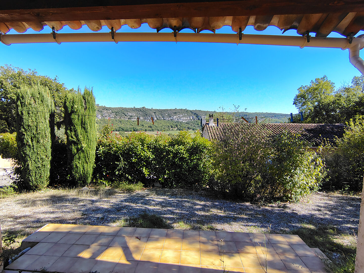 Depuis la terrasse vous pouvez admirez la vue sur les collines environnantes et profiter du cadre serein et de la douceur de vivre de ce petit lotissement.