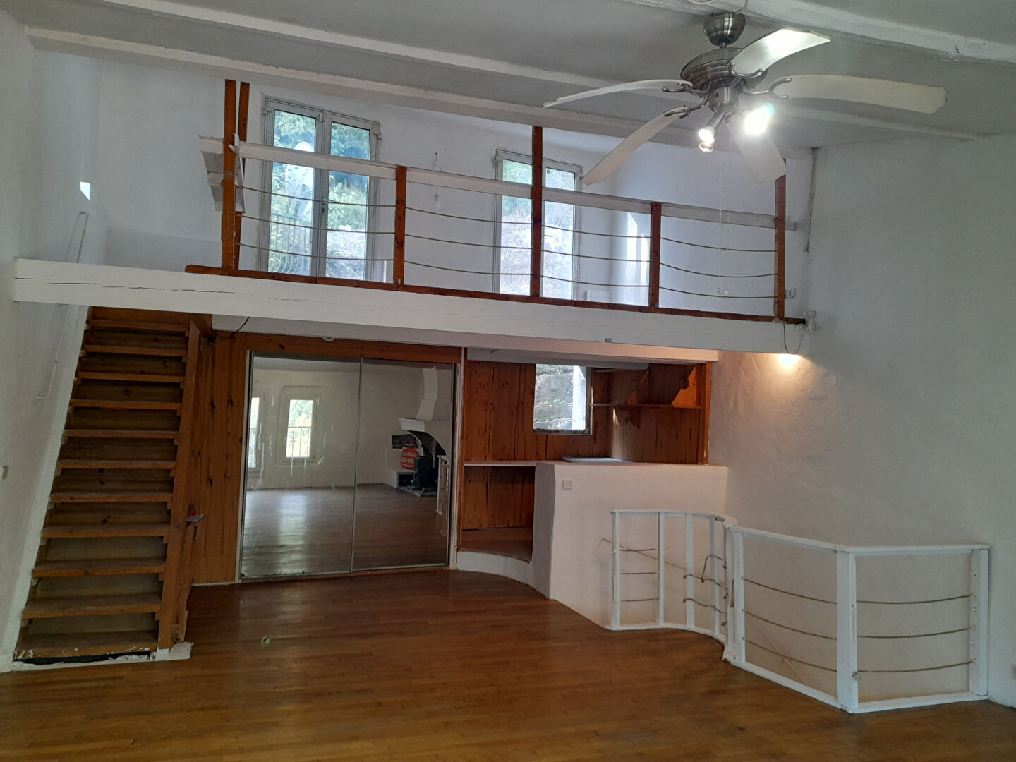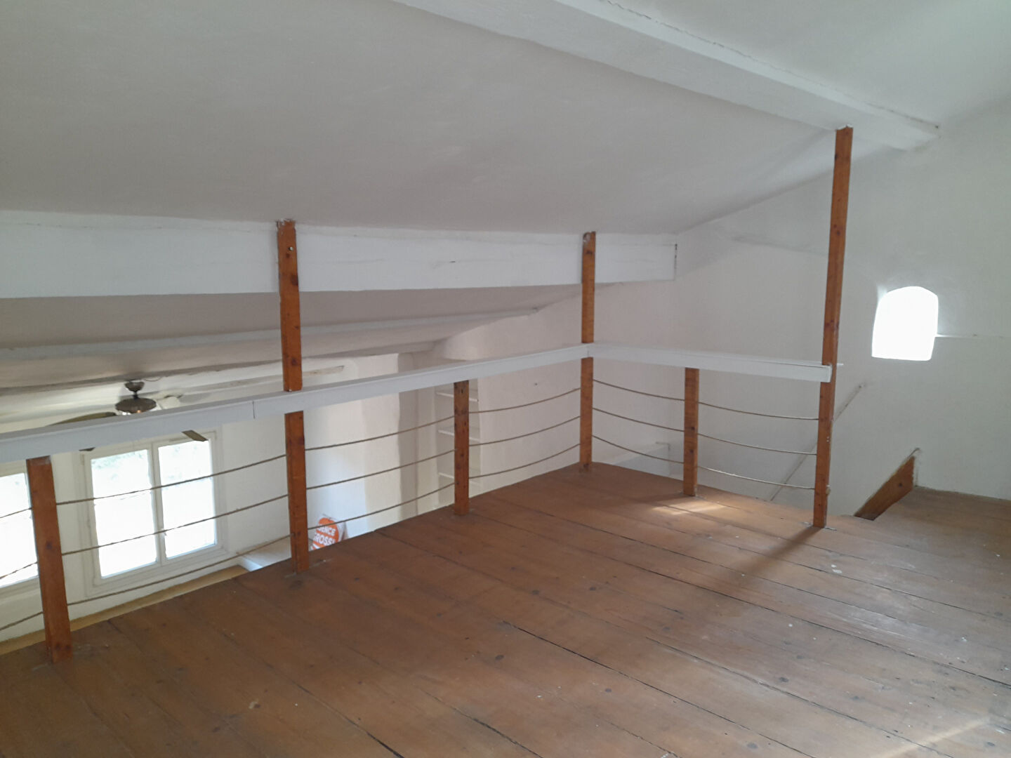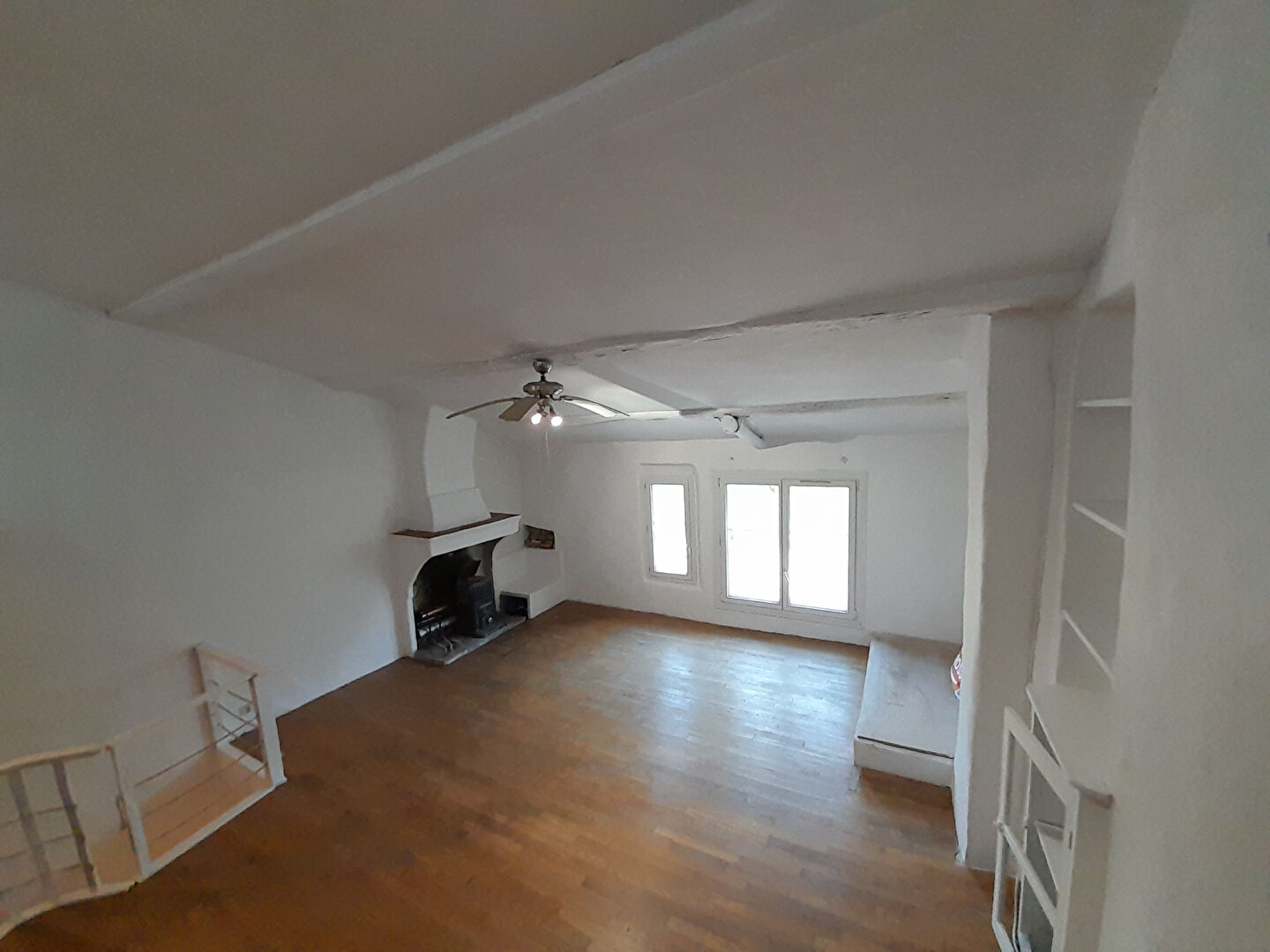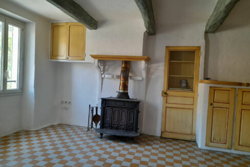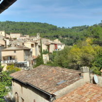 – Etage 3 : Un large espace de vie traversant et lumineux d’une surface d’environ 40m2 avec une cheminée, du parquet ancien, des poutres apparentes et une mezzanine avec 2 portes-fenêtres donnant sur un extérieur : colline classée Zone Naturelle avec une vue sur le village ancien.