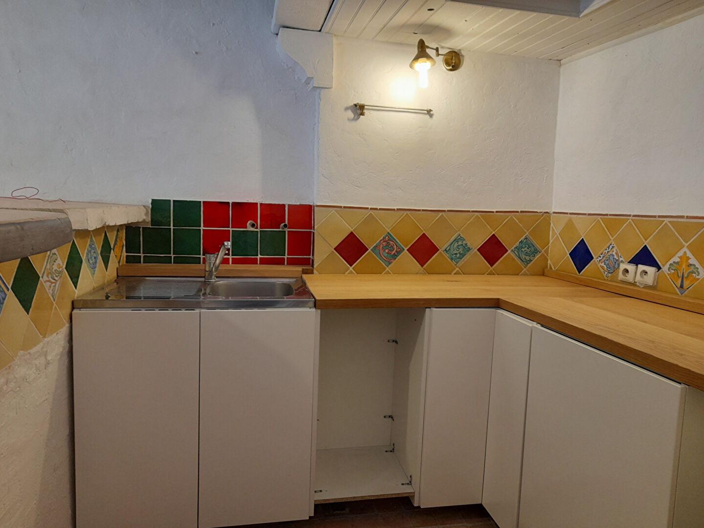 – Au rez-de-chaussée : une grande pièce lumineuse (ou séjour ) pouvant être aménagée en atelier ou en galerie d’art se prolongeant par un espace en pierres apparentes creusé dans la roche .