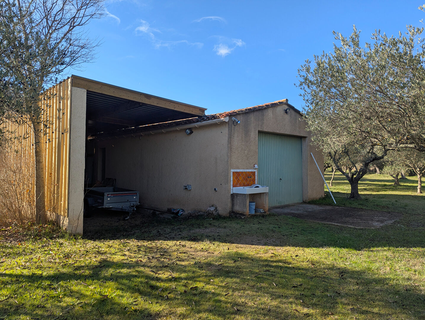 Sur un terrain plat arboré d’oliviers et d’essences méditerranéennes entièrement clos, un garage/atelier de 95 m², un abri pour camping-car de 28 m² (3,20 m de hauteur), une piscine à rénover.