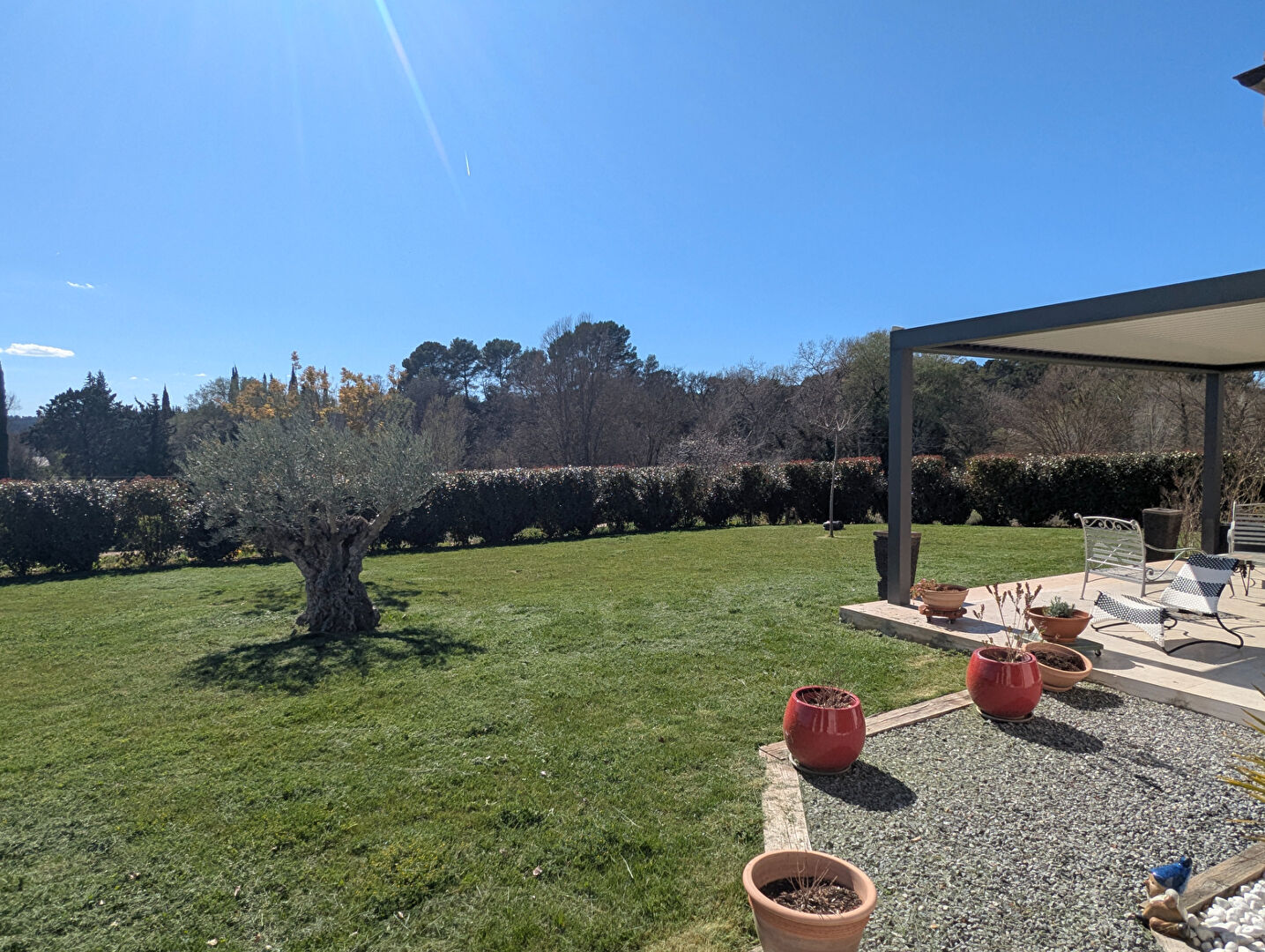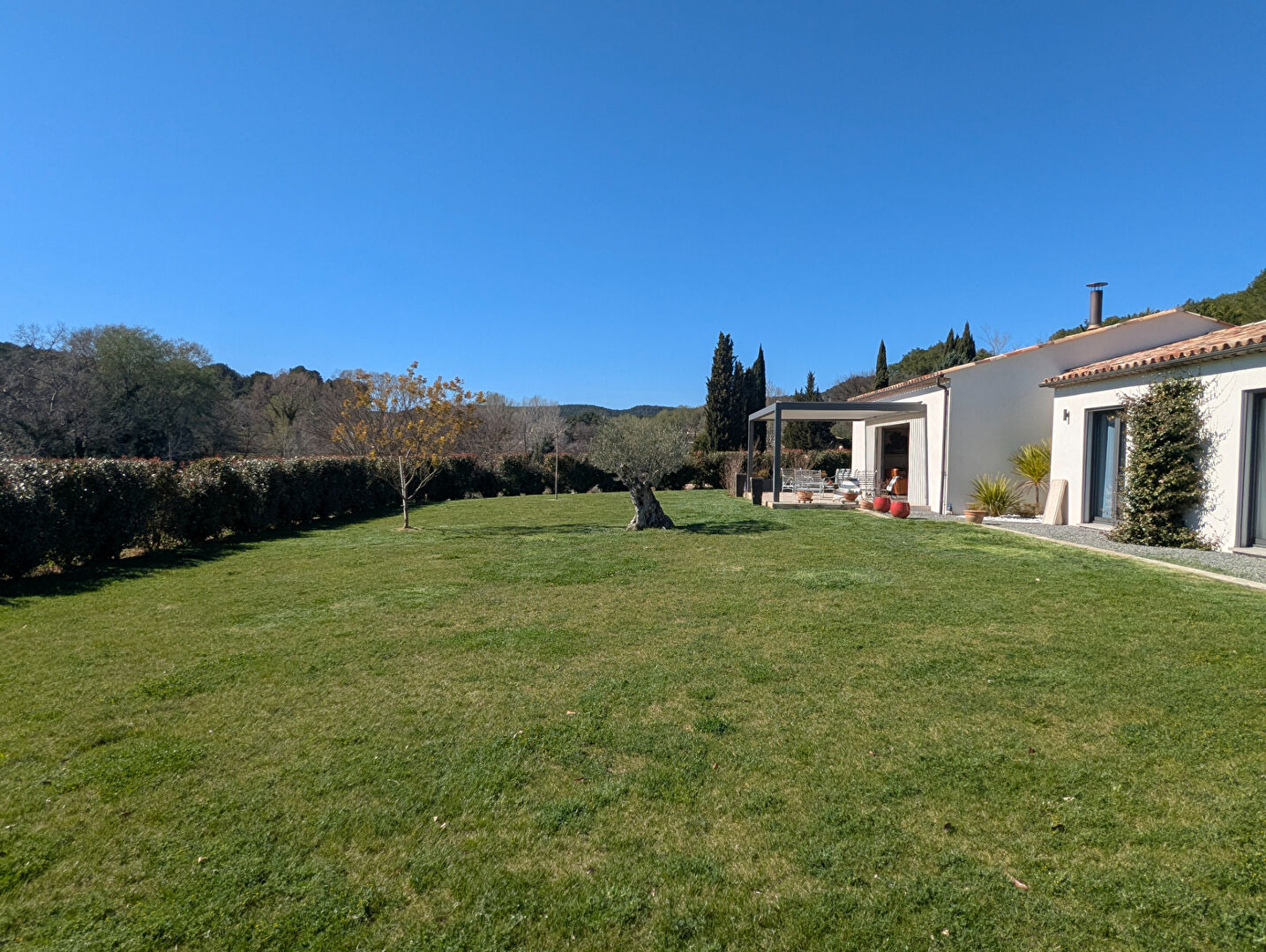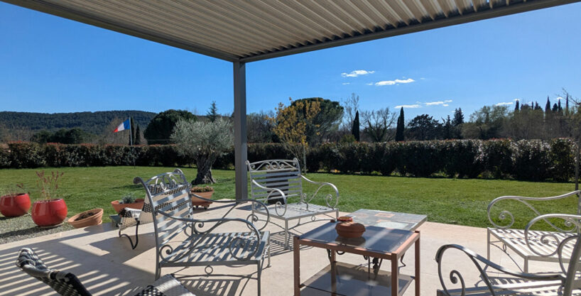 Elle dispose d’une entrée, un vaste espace de vie de 82 m² avec cuisine US aménagée et équipée (électroménagers NEFF), une arrière cuisine, une suite parentale avec salle d’eau, WC séparé et un grand dressing, 2 chambres, une salle d’eau et un WC invité. Menuiserie aluminium à galandage, volets roulants avec isolation thermique, domotique, plancher chauffant et rafraîchissant par pompe à chaleur, isolation phonique des chambres, aspiration centralisée, adoucisseur d’eau. Un double garage isolé et carrelé. 2 terrasses avec pergolas bio climatiques BIOSSUN. Terrain de 3.697 m², possibilité de faire une piscine, arrosage automatique, eau par forage (installation existante pour l’eau de ville), robot pour la tonte de la pelouse, tout à l’égout. Maison en parfait état et très agréable à vivre, Classée A en DPE.