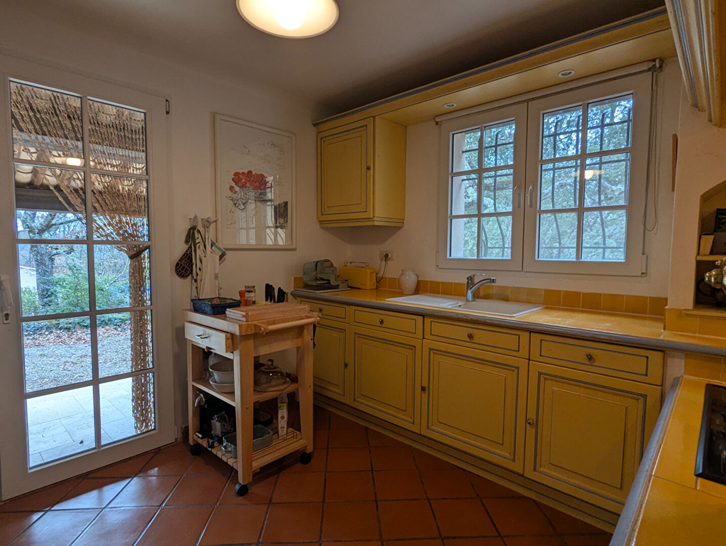 Une cuisine donnant sur une terrasse couverte,