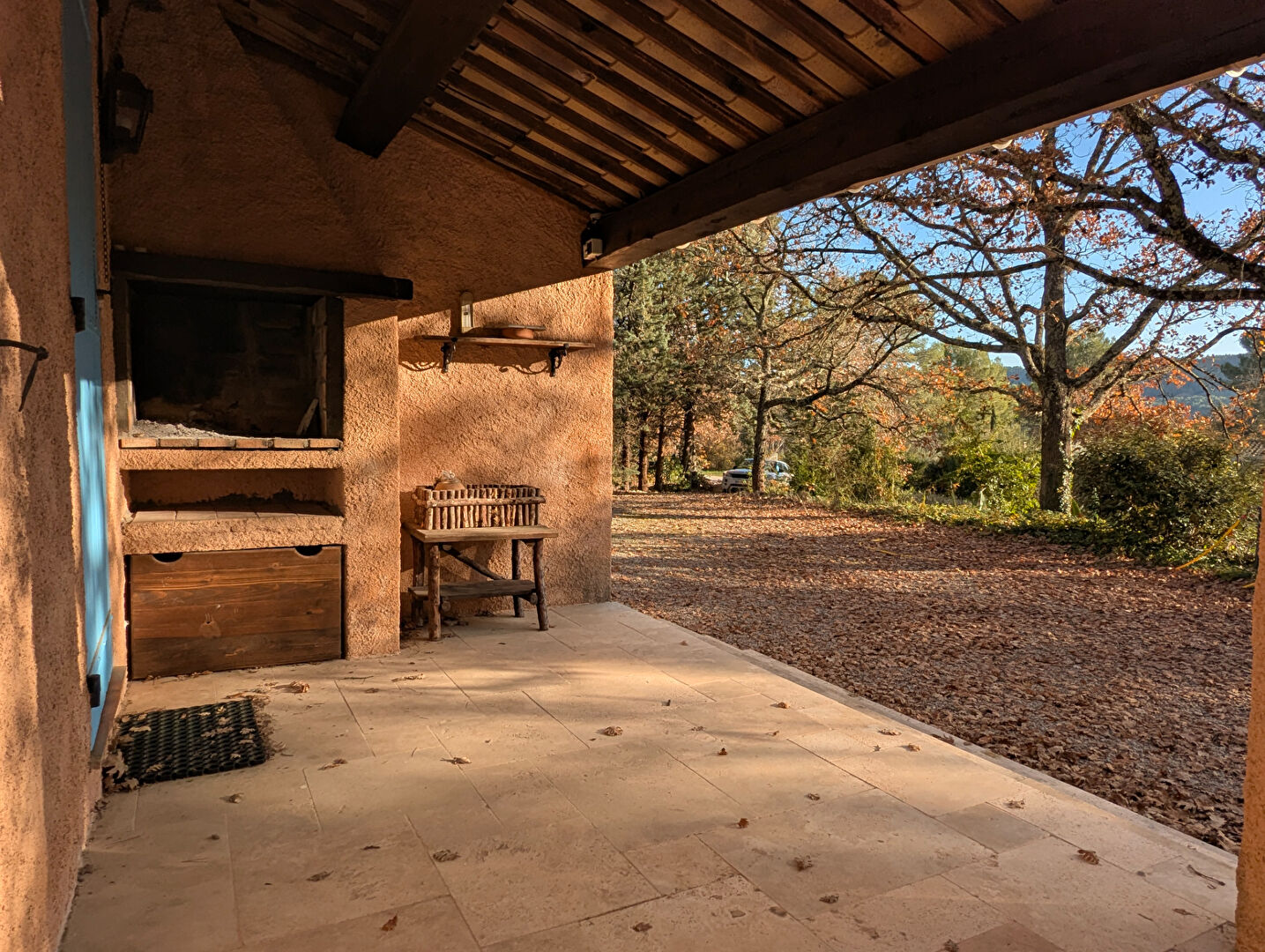 Un séjour avec cheminée donnant sur une terrasse couverte,