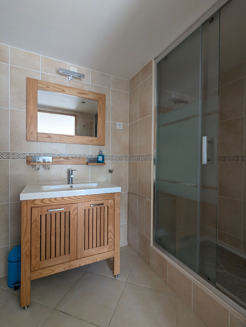 Une dépendance de 47 m² comprenant une chambre avec salle d’eau/WC, une cuisine et une véranda. Double vitrage alu, climatisation réversible, poêle à bois.