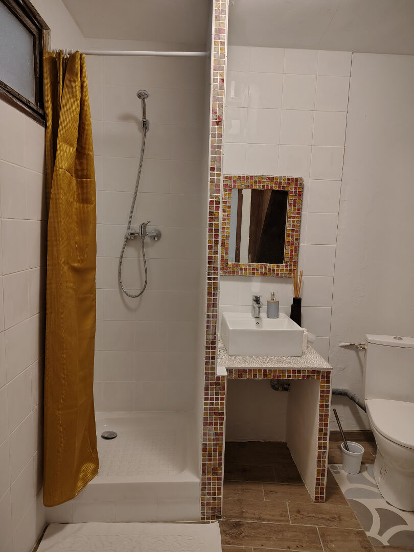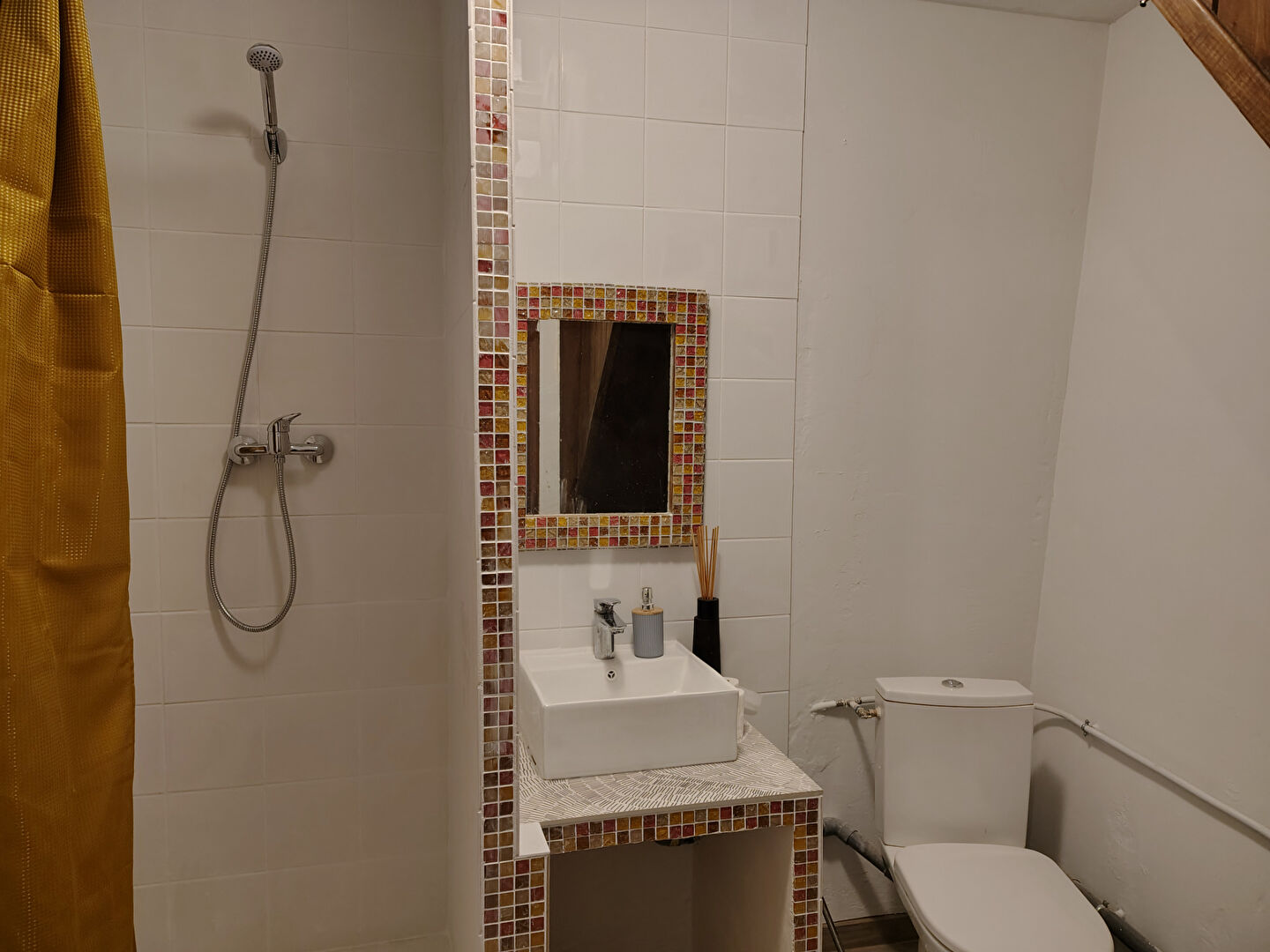 – Au rez-de-chaussée : une salle à manger avec un coin cuisine et une salle d’eau avec une douche et un WC.
