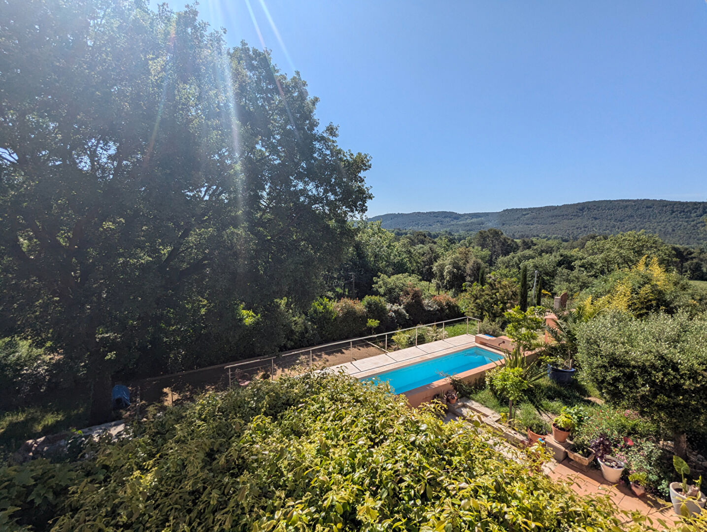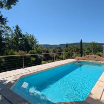 Une jolie terrasse avec pergola en fer forgé donnant une une jolie vue dégagée sur la campagne et sur le village de Tourtour, une terrasse couverte, 2 remises/ateliers. Sur un terrain clos de 3.000 m² environ, un bel espace piscine 9 m X 3.5 m, un terrain de pétanque, oliviers et fruitiers.