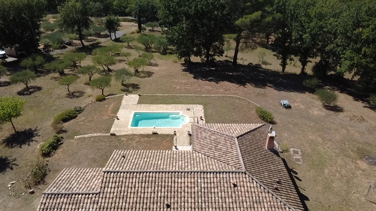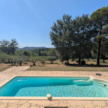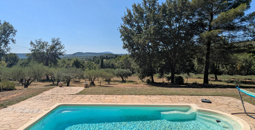 Sur un joli terrain plat et arboré d’oliviers (40), un espace piscine 8 m X 4 m avec nage à contre courant, un abri jardin.